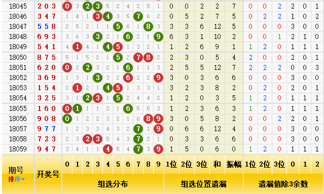 组选位置上的遗漏振幅是0,近10期分别是4-7-6-2-5-3-2-4-6-0,几乎都是偶数振幅,奇数只有两次,本期的话看好奇数穿插一下,所以本期看好奇数的振幅开出。