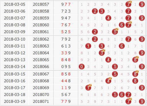回顾上期的开奖结果为:779,大大大、奇奇奇的组三形态,和值是23,跨度为2,结合综合走势图看,近期号码爆冷的行动还在持续进行中,目前两个冷号2号和3号都有爆冷的希望,热号上隔期号最为活跃,本期4号可防。