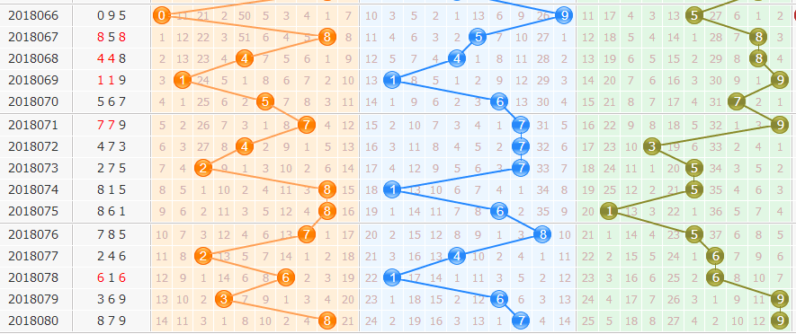 重复号:879的开出使得号码78走热,号码6由温转热。本期关注重复号码个数为2个,关注号码79重复。