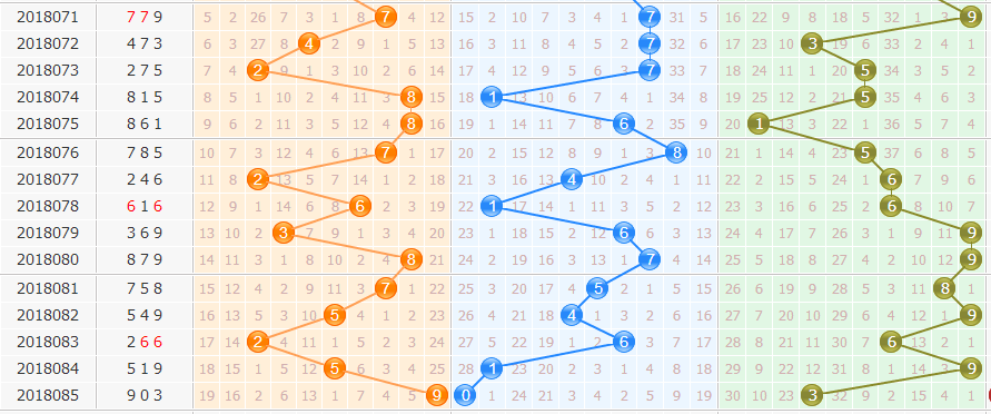 从近50期看,开出9有5次。到7有2次,到2有1次,重复1次。我们从“遗漏表”中得出。首先排除0路的号,再排遗漏期数多的1,几率小的5、2,本期选择4、7、8。