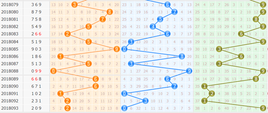 个位数是最难判断的,开出9到8、3有2次,到4、7、6有1次,重复1次。首先排除0路的号,再排遗漏期数多的4,几率小的1、2,本期选择5、7、8。