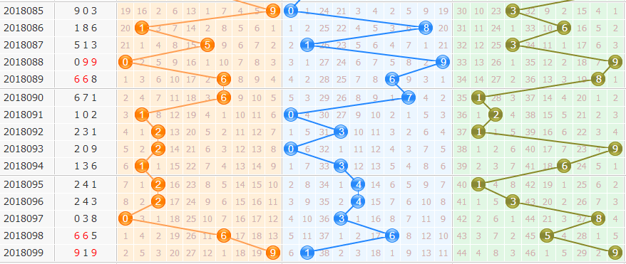 从近50期看,开出9有5次。到7有2次,到1有1次,重复1次。我们从“遗漏表”中得出。首先排除0路的号,再排遗漏期数多的4,几率小的2、1,本期选择5、7、8。