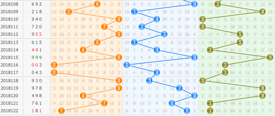 ③012路分析:为0路出0个,1路出2个,2路出1个;本期看好2路球出号,关注8码,综合分析看好,002 022路组合出号。