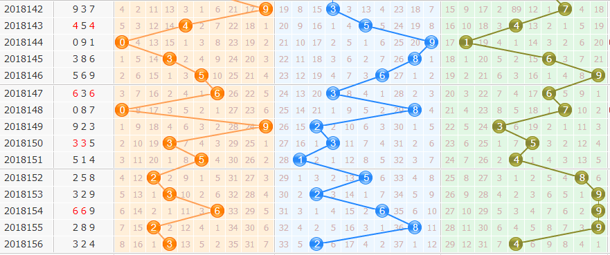 重复号:324的开出使得号码23走热,号码4由冷转温。本期关注重复号码个数为2个,关注号码34重复。