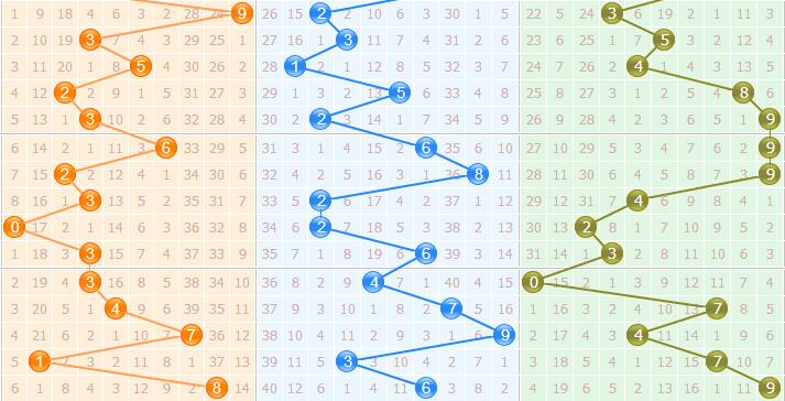 三、最后来看个位的情况,上期开出了9号球,个位上号码顺着走势向右延伸,在上期达到了最大数9号球位置,目前只要盯防走势反弹,关注2号,防6。