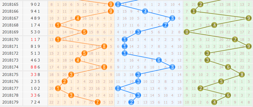 和值:上期开出和值13,和值呈现出走小的趋势,本期应关注走大,关注和值14、16、18开出。