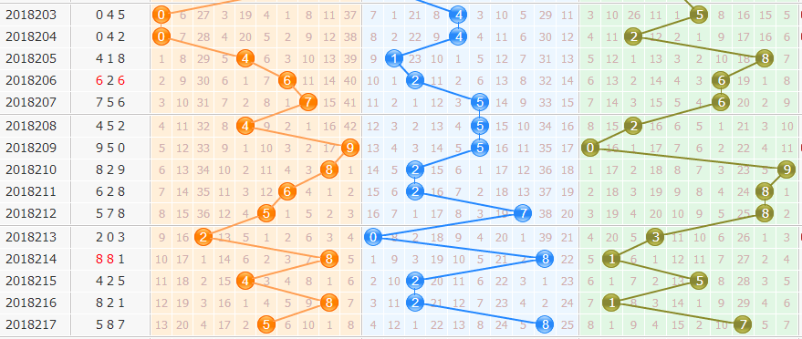③012路分析:为0路出0个,1路出1个,2路出2个;本期看好1路球出号,关注7码,综合分析看好,001 011路组合出号。