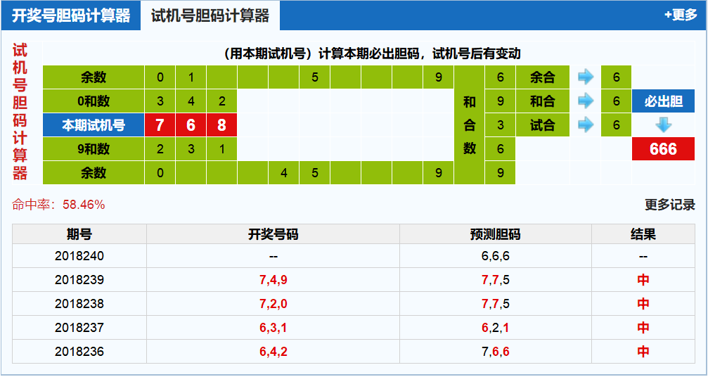 今晚的试机号开出了组六形态768,全大组合,两偶一奇组合,和值开出21,跨度开出2,102路号码出现。试机号今晚是开出了三连号,近期试机号出号位置明显变动比较大,且对开奖号码也有着不容小觑的影响。本期试机号胆码计算器胆码推荐:666,今晚的试机号胆码计算器推荐的是豹子号,全偶组合,根据试机号胆码计算器近期的命中率来看,形式是一片大好啊,不过大家要小心物极必反,单单从号码走势上分析,号码6近期出现的次数并不多,算是温号走势,本期间隔2期未出,所处的位置倒是近期的黄金地带,是比较值得大家防一防的。