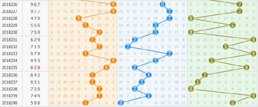 重复号:506的开出使得号码56走热,号码0由冷转温。本期关注重复号码个数为2个,关注号码05重复。