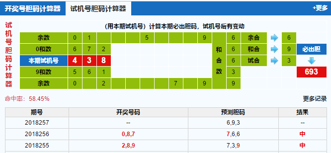 结合试机号胆码计算器来看,6号球目前是位于斜连号的位置,近期斜连号也是有望开出的,可以小防一下;9号球已经连着两次都是隔期出号了,现在刚好是空缺了一期,看好9号球再次隔期开出;3号球算是一个冷号,但是之前3号球差不多间隔四五期的时候就有开出,本期小防3号球。