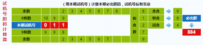 今日3d试机号的开奖号码是011,试机号胆码计算器开出了884,从试机号跟试机号胆码计算器来看,本期未出现重合码。试机号开奖号码为全小模式,胆码计算器为两大一小形式,近期小号出号出现明显回补,建议本期关注两小一大的形式隔期开出。两偶一奇形式已经连开四期,本期建议主看奇数占优形式的回补。邻号目前依然占据热门发展势头,所以本期对于1号球和4号球要继续留意。八号球是当前的热号,但开出间隔期较久,所以本期不看好。