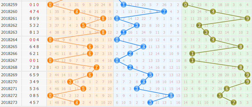 ③012路分析:为0路出0个,1路出2个,2路出1个;本期看好1路球出号,关注4码,综合分析看好,001 011路组合出号。