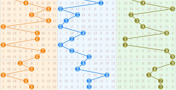 三、最后来看个位的情况,上期开出了7号球,个位上近期走势基本被大数所控制了,大数上预计会有回补出号的现象,建议关注6和9。