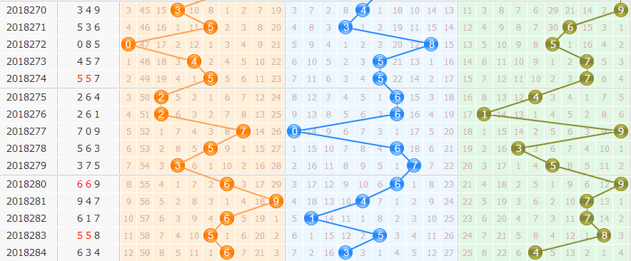重复号:634的开出使得号码36走热,号码4由冷转温。本期关注重复号码个数为2个,关注号码34重复。