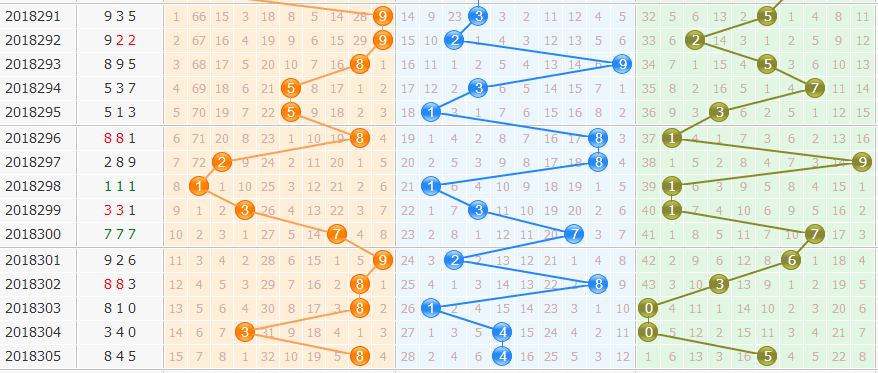 从近50期看,开出8有7次。到5有2次,到0、2、3有1次,重复1次。我们从“遗漏表”中得出。首先排除2路的号,再排遗漏期数多的4、6,几率小的3、9,本期选择0、1、7。