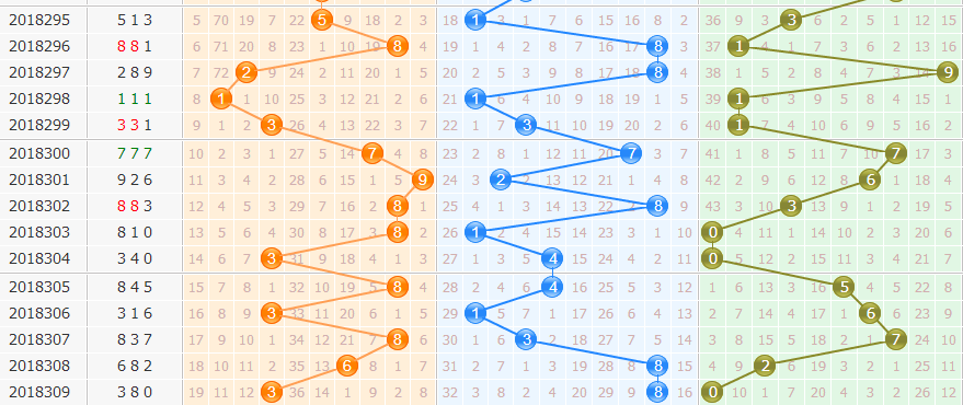 上期开出380,和值11,2偶1奇,2小1大,百位3遗漏2期、十位8重复,个位0遗漏4期,从整个出号来说,总遗漏值达到6期,说明有较热的号出现。而除3余数形态020路。