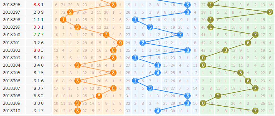 个位数是最难判断的,开出7到4有2次,到8、3、6、2有1次,重复2次。首先排除1路的号,再排遗漏期数多的8、9,几率小的0、2,本期选择3、5、6。