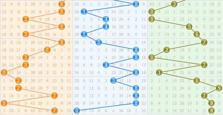 三、最后来看个位的情况,上期开出了8号球,个位上大数区域密集出号,本期小心9号回补,同时盯防走势反弹,严防1号回补。