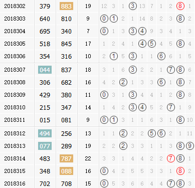 回顾:18316期开奖结果为:708;奇偶形态:奇偶偶;大小形态:大小大;和值:15;跨度:8;