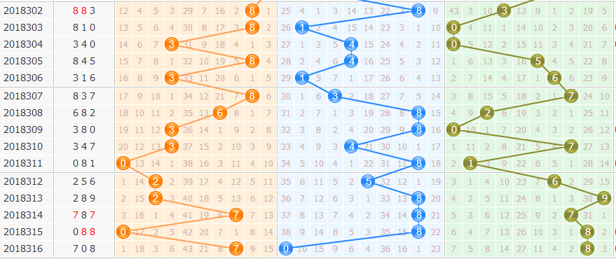 个位数是最难判断的,开出8到9、4有1次,重复1次。首先排除2路的号,再排遗漏期数多的4、3,几率小的7、9,本期选择0、1、6。