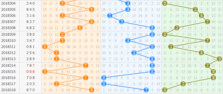 从近50期看,开出8有7次。到3有2次,到5、2、6有1次,重复1次。我们从“遗漏表”中得出。首先排除2路的号,再排遗漏期数多的4、1,几率小的7、0,本期选择3、6、9。