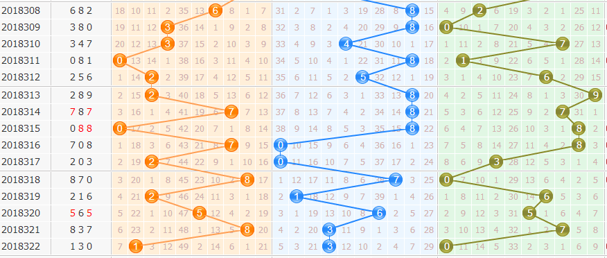 十位同上,近50期中,开出3到8有2次,到2、1、7有1次,重复2次。首先排除0路的号,再排遗漏期数多的2,几率小的1、7,本期选择4、5、8。