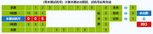 本期胆码计算器与试机号没有重合的号码。结合近期试机号命中开奖号走势图来看,近期试机号的命中几率不算很高,从另一个角度来看,便是不太看好试机号的号码。而本期胆码计算器给出的号码完全与试机号向背,我们可以适当关注一下胆码计算器号码。