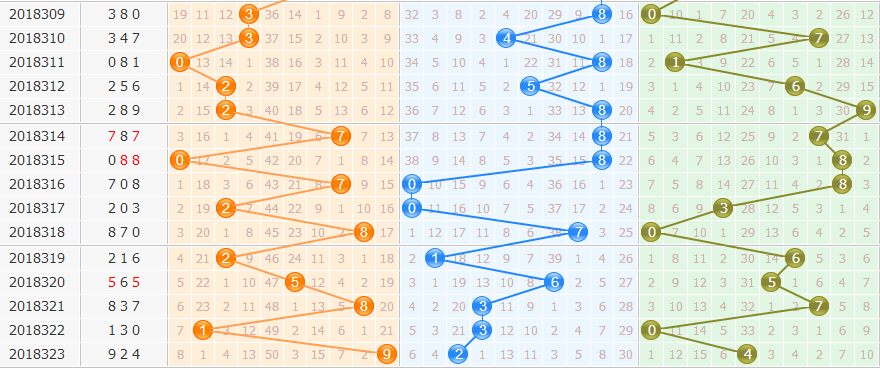 个位数是最难判断的,开出4到1、2、6有1次,重复1次。首先排除1路的号,再排遗漏期数多的2、9,几率小的0、5,本期选择3、6、8。
