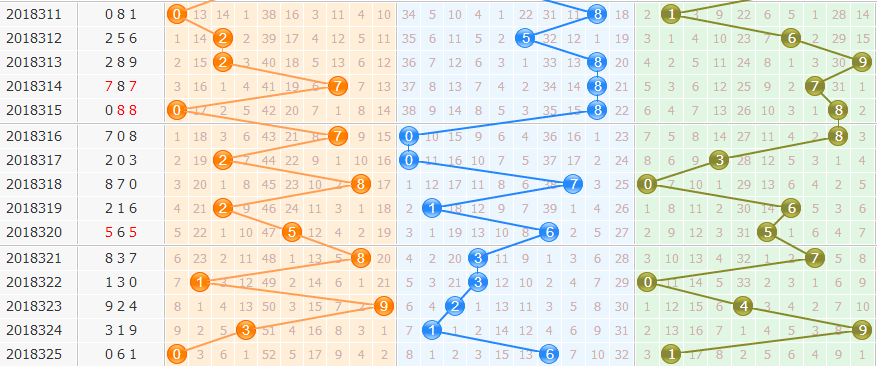 十位同上,近50期中,开出6到0、7、4、3有1次。首先排除0路的号,再排遗漏期数多的4,几率小的1、2,本期选择5、7、8。