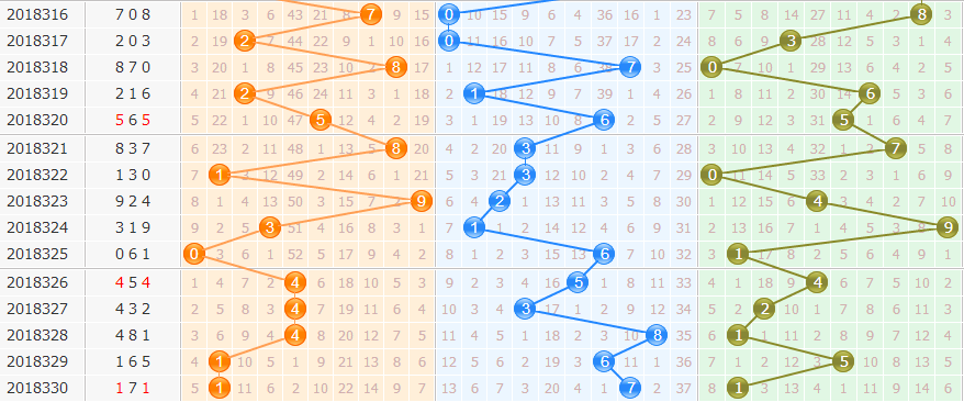 个位数是最难判断的,开出1到7有2次,到9、6、4、5有1次,重复1次。首先排除1路的号,再排遗漏期数多的8、3,几率小的5、2,本期选择0、6、9。