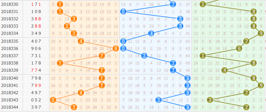 从近50期看,开出3有8次。到8、0有2次,到7、4有1次,重复1次。我们从“遗漏表”中得出。首先排除0路的号,再排遗漏期数多的5,几率小的4、7,本期选择1、2、8。