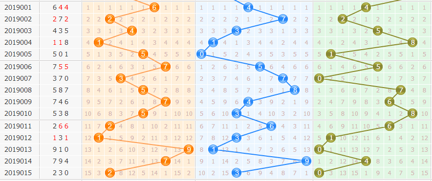 ③012路分析:为0路出2个,1路出0个,2路出1个;本期看好1路球出号,关注4码,综合分析看好,001 011路组合出号。