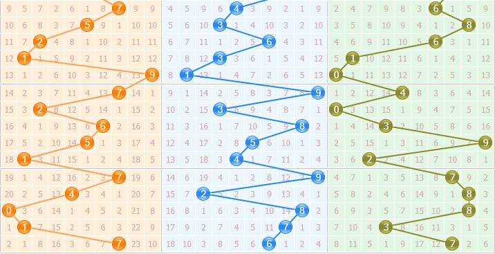 二、其次在十位上,开出了一个6号,近期十位上出现了斜连号,678三码连号出现,走势拉动振幅很低,主要看5,防振幅拉大,关注9。