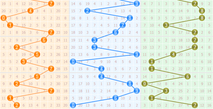 和值分析:上期的和值为9点,按照目前和值走向看,上期和值上升1点,面对之前大幅度上升和下降的走势,上期1点振幅的出现明显缓和了和值的振幅,本期和值保留在第二区间最为稳妥,建议看12和13。