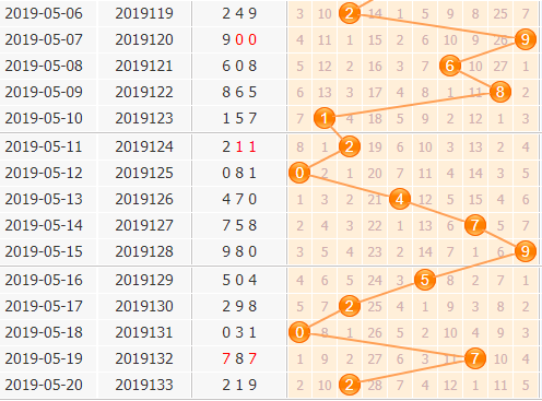 百位上期开出号码2,2路号码开出,而且2路号码在百位上开出是属于强势的,本期可以看好2路号码的继续出号;5号球和8号球是剩下的两个2路号码,都是在升温中的,本期可以留意这两个号码的表现;2路号码之后也要小防0路号码,尤其是0号球,因为2号球之后很多次都是开出了0号球。本期小孔明根据号码走势分析,重点推荐本期胆码胆码:0158