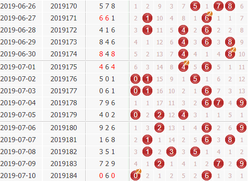 上期开出组六形态060,两小一大组合开出,全偶组合,和值开出6,跨度开出6,000路号码。从号码走势图上分析,上期出号位置明显左移了,小号位置开出了两个号码,结合近期的号码走势分析,预计本期出号位置会小幅度的右移,中大号走势会比较占优,本期重点推荐综合杀三码:015