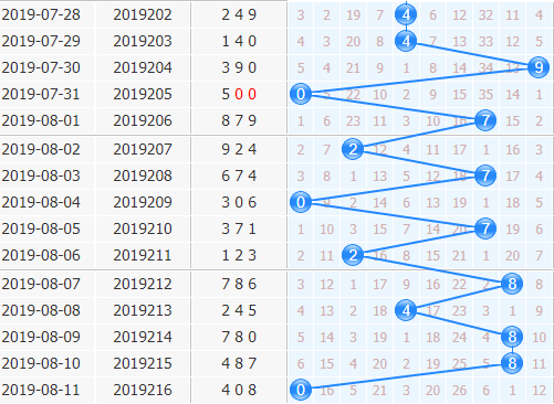 上期在十位上开出号码0,0路号码开出,不过现在号码走强的是2路号码,开出比较强势,所以本期重点看好2路号码开出,2号球是离0号球最近的,开出也还可以,小防一下;8号球是有升温趋势的,看好8号球的表现;1路号码开出也不弱的,尤其是7号球都是跟在0号球后面开出,本期也要看好7号球。