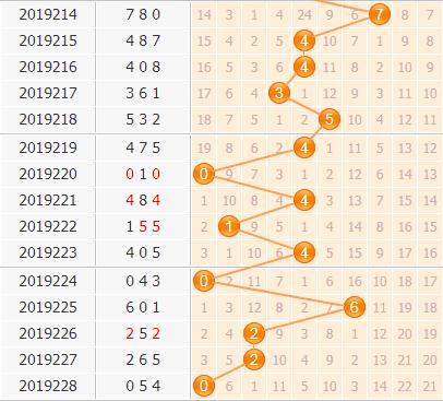 上期开出了054,百位上是开出了0号球,结合百位走势看,目前小区号码仍旧处于优势阶段,且有走热的趋势,在继2号之后,热度颇高的0号也有重复出号的可能;另外小区上现在剩下一个冷码就是3号,本期严防3号解冻,4号球位置在前期大热,在休息5期之后严防再度回补出号;近期走势上最大振幅点为6点,为了防止大区号码进行反扑进行更大振幅的拉动,本期盯防7号爆冷。