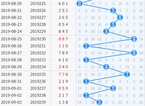 十位上期开出了3号球,分析十位上的走势来看,十位号码现在有些缓和下来,上期振幅开出了2,比之前都小,那么接下来十位出号振幅应该也是稳定2左右的,小振幅为主;5号球跟3号球就是振幅2,而且也是在上升趋势上,再结合5号球近期出号也是有望的,可以看好5号球;1号球近期也是一个热号,对称走势也很热门,本期也看好1号球;7号球近期也是有开出的趋势的,本期也要小防一下。
