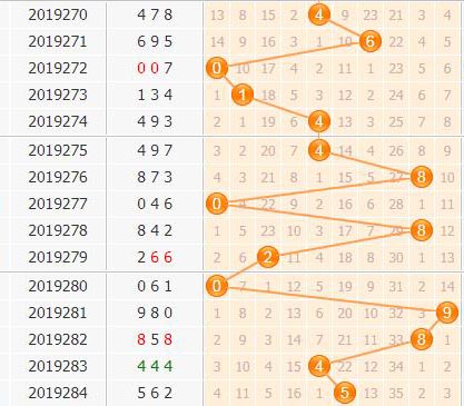 百位上期开出号码5,结合百位走势分析,上期5号邻着4号开出,现阶段中后区奖号开出数量较多,在单一小幅度的拉动下,本期走势上有向左反弹的趋势,加上目前大区号码热度维持能力比较一般,走势上总体来说显示较为零散,在小振幅拉动的范围内,本期建议关注小数号码,推荐看好0123。