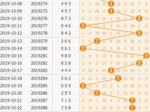 百位上期开出号码7,结合百位走势分析,7号球是重复开出了,百位上重复号开出并不多,不过每一次重复开出都是紧跟着号码走冷的,所以接下来冷号开出的可能性是最大的。6号球就在7号球的边上,而且空缺了17期,是一个大冷号,可以关注一下它的表现;最冷的是3号球,遗漏了20期,本期也要严防它的出号;9号球之前是走冷的,现在有七期没有开出,可以留意一下它的回暖,推荐看好3689。