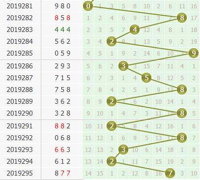 个位上期开出号码7,7号球间隔19期出现,个位的出号位置还是回到了之前的出号状态,大号位置本期连续开出的几率不大,建议大家本期在选择杀号的时候可以重点参考一下中大号走势,特别是重复号,本期个位推荐重点杀一码:7。小号位置本期号码4出现几率不大,建议也可以作为重点杀一码:4