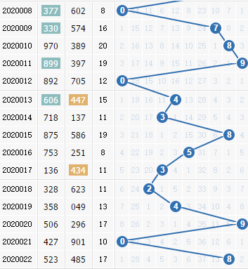 上期十位上开出了8号球,号码在最右端,近期十位上号码开出都是在两端集中,要么是最小号码,要么就是开到最大,中间段号码取值比较少,本期号码也要往两端看。8号球是上期开出的,9号球和7号球就在8号球的两边,十位上邻码开出比较多,本期多关注;0号球之前有走冷,本期可以关注0号球的升温。