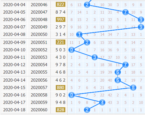 第20060期开出了828,十位上开出了2号球,开出了一个小数,近10期里大数开出了4期,小数开出了6期,小数走高,从走势来看,4期小数-4期大数-3期小数,根据这样的走势来看,本期看好小数的开出。