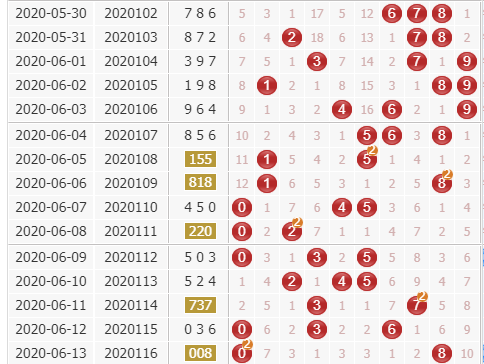 十位分析:根据多年来对十位杀号经验,推荐以下杀号技巧绝杀本期十位号码呈现给大家,上期开奖号和值尾与跨度的和的个位数绝杀十位即6,上期开奖号十位杀本期十位即0,上期开奖号百位+个位的和取尾数杀本期十位即8,上期开奖号十位+上上期开奖号十位的和取尾数杀本期十位即3,隔六期开奖号十位杀本期十位即4,十位杀号综合推荐60834,绝杀程度从左到右依次降低,谨慎参考。