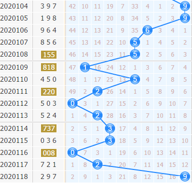 十位上期开出号码9,大号奇数号码出现,号码9上期间隔12期出现,参考之前的走势来看,这次号码9爆冷之后还是有一定几率出现,后期大家可以小防一下号码9重复出现。小号近期号码走势明显在十位比较占优,后期还是有很大几率出现。太阳风本期根据十位杀号公式:上期开奖号码跨度加和尾之和取个位杀本期十位一码:7+8=15,本期十位重点推荐杀一码:5。