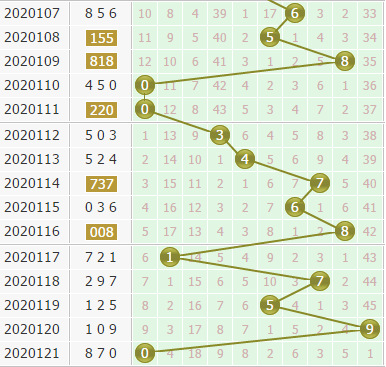 个位上期开出号码0,小号码开出,分析个位上的大小走势来看,小号码开出没有大号码强势,近期也是要多关注大号码的表现。6号球和8号球稍微冷一些,不过号码都是在回暖的,本期就看好这两个号码;9号球是从一个大冷号回暖的,本期看好它的隔期回补。