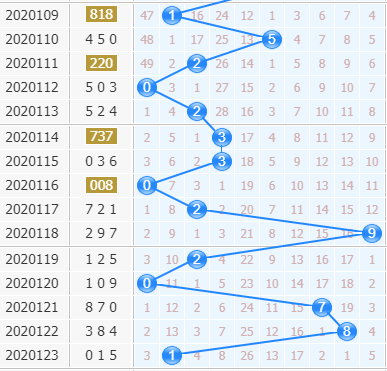 十位上期开出号码1,小号奇数号码出现,十位上期出号位置大幅度左移,出号位置上期从大号位置转移到了小号位置,本期小号还是有可能会连续出现的,建议小防。重复号1本期出现几率比较小,建议大家作为主杀。太阳风本期参考十位杀号公式:上期开奖号码跨度加和尾之和取个位杀本期你十位一码:5+6=11,本期十位杀一码:1