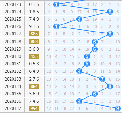 十位上期开出号码9,大号奇数号码出现,十位上期出号位置大幅度右移,本期预计出号位置会再次左移,大号位置本期还是一定的几率会重复出现的,重复号近期走势比较冷门,本期建议大家可以重点杀一码:9。太阳风本期根据十位杀号公式:上期开奖号码跨度加和尾之和取个杀本期十位一码:5+2=7,本期十位重点推荐杀一码:7