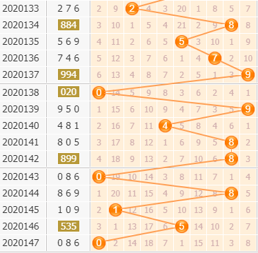 百位上期开出号码0,0路号码开出,不过百位上2路号码开出最强势,也是跟在0路号码开出的,本期重点看好2路号码表现;8号球升温是明显的,近期肯定要多加关注;5号球之前刚刚作为冷号开出,小防隔期回补;4号球开出比较稳定,出号间隔也是差不多都是在八期左右的,当前有机会出号,小孔明本期参考号码走势分析,重点推荐本期百位综合胆码:0458
